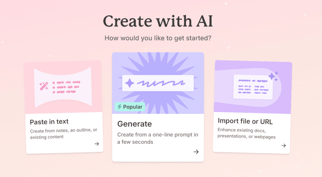 Q: How does it compare to Canva or Beautiful.ai? A: Faster generation and more modern layouts; Canva wins for advanced manual design.